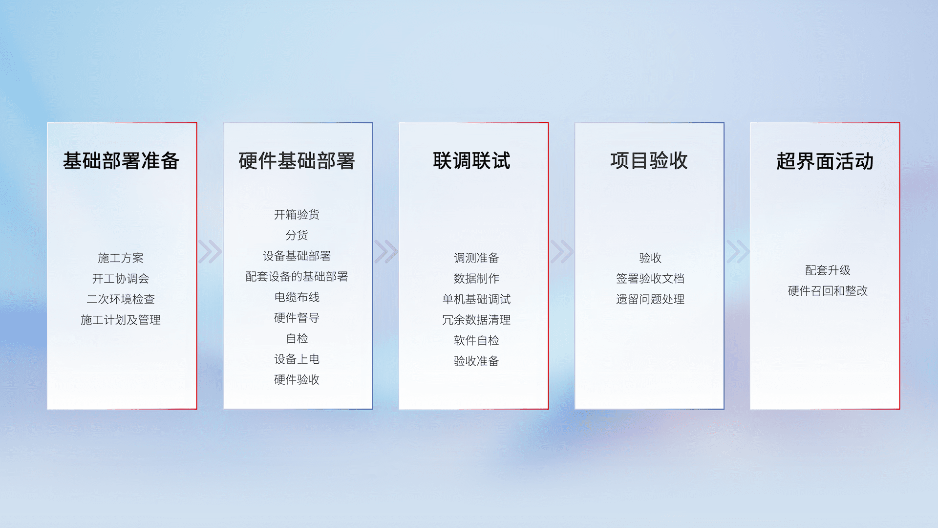 从基础部署准备、、、硬件基础部署、、联调联试、、、、项目验收、、、越界面活动的全过程可追溯,,,保证施工质量和进度。。